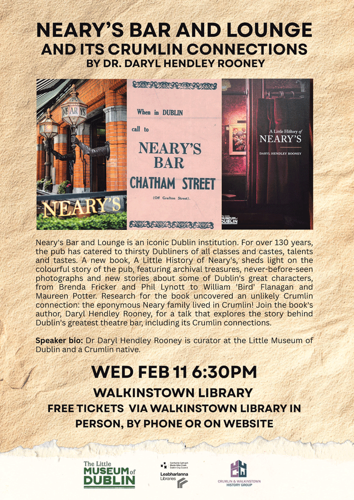 The group presents a talk by Dr Daryl Hendley Rooney, a curator at the Little Museum of Dublin and a Crumlin native, about Neary’s Bar and Lounge and its Crumlin connections.
