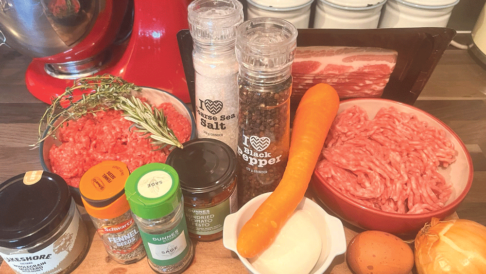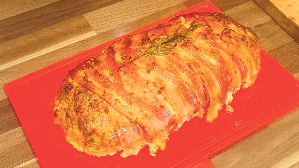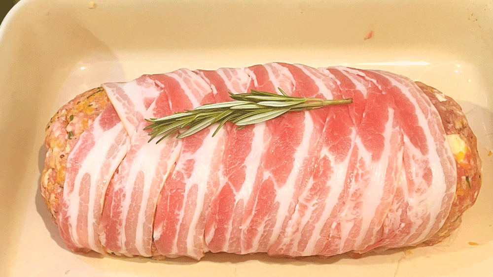 - In a large baking dish, mould into a loaf shape and cover with the streaky bacon in a criss-cross design. Cover with tinfoil and roast for 30 minutes.