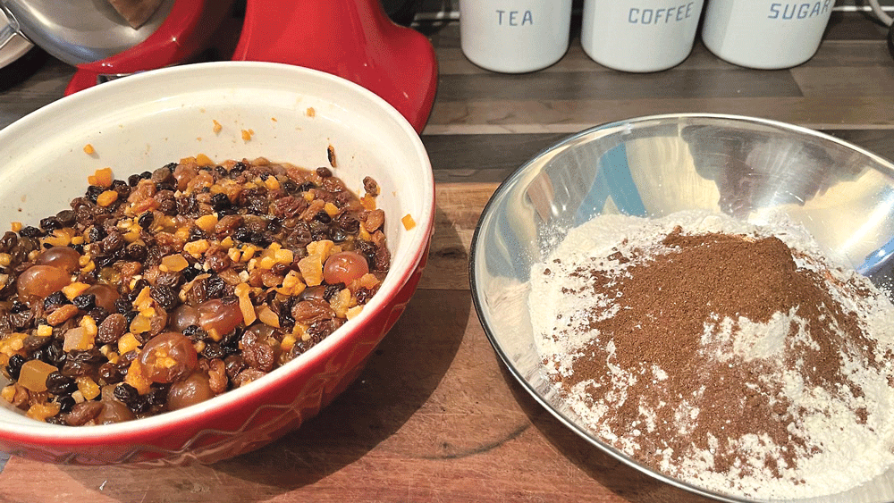 - Place the dried fruits in a large mixing bowl with the cold tea and leave to soak overnight. I cover mine with a clean tea towel.