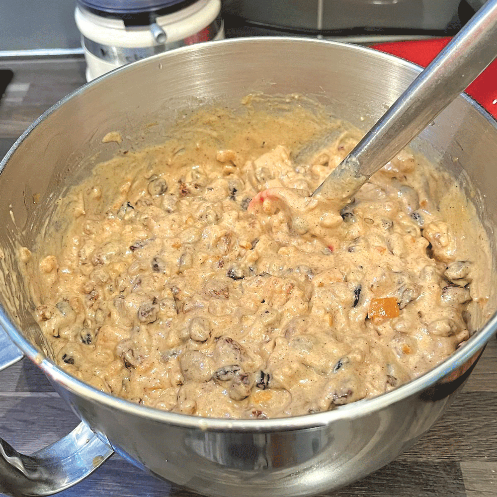 - Then add in the tea soaked fruits and any remaining tea into the bowl and mix together well.