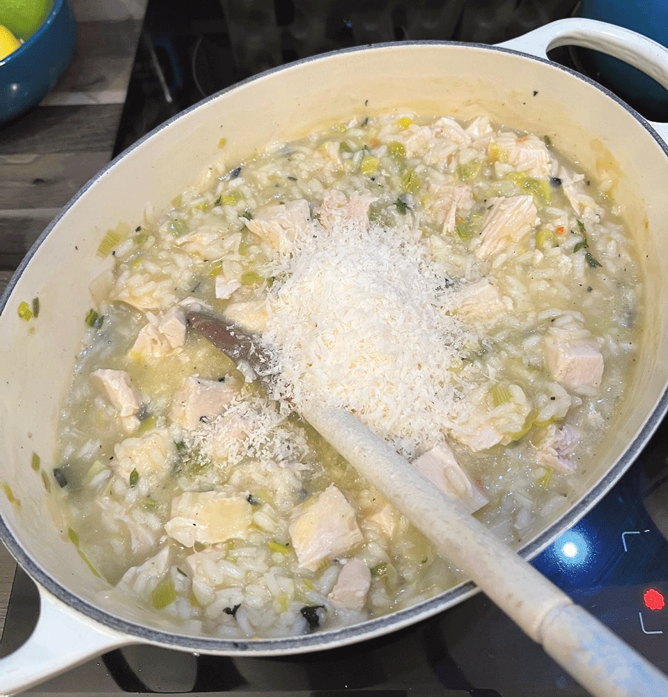 If you have any cooked turkey / chicken skin left over pop onto a baking tray and roast in the oven until nice an crisp, break it up and scatter across the top of the risotto.