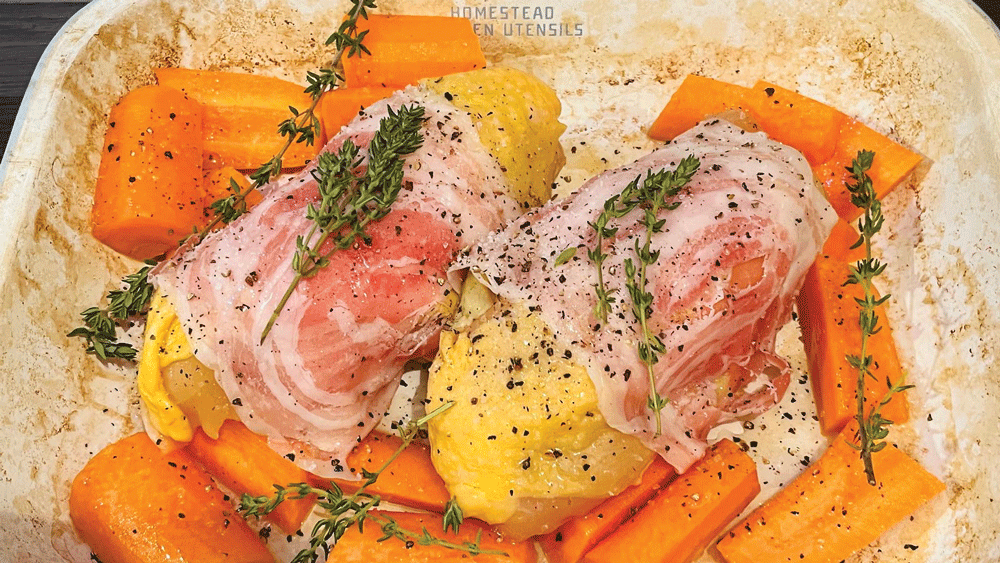 This twist on a roast chicken dinner is a much easier and less time-consuming way to pull together a delicious roast. Using skin on chicken breast fillets, I cut a slit in each one, stuff it with my Nanny Rena’s homemade stuffing and wrapped in delicious thin slices of pancetta.