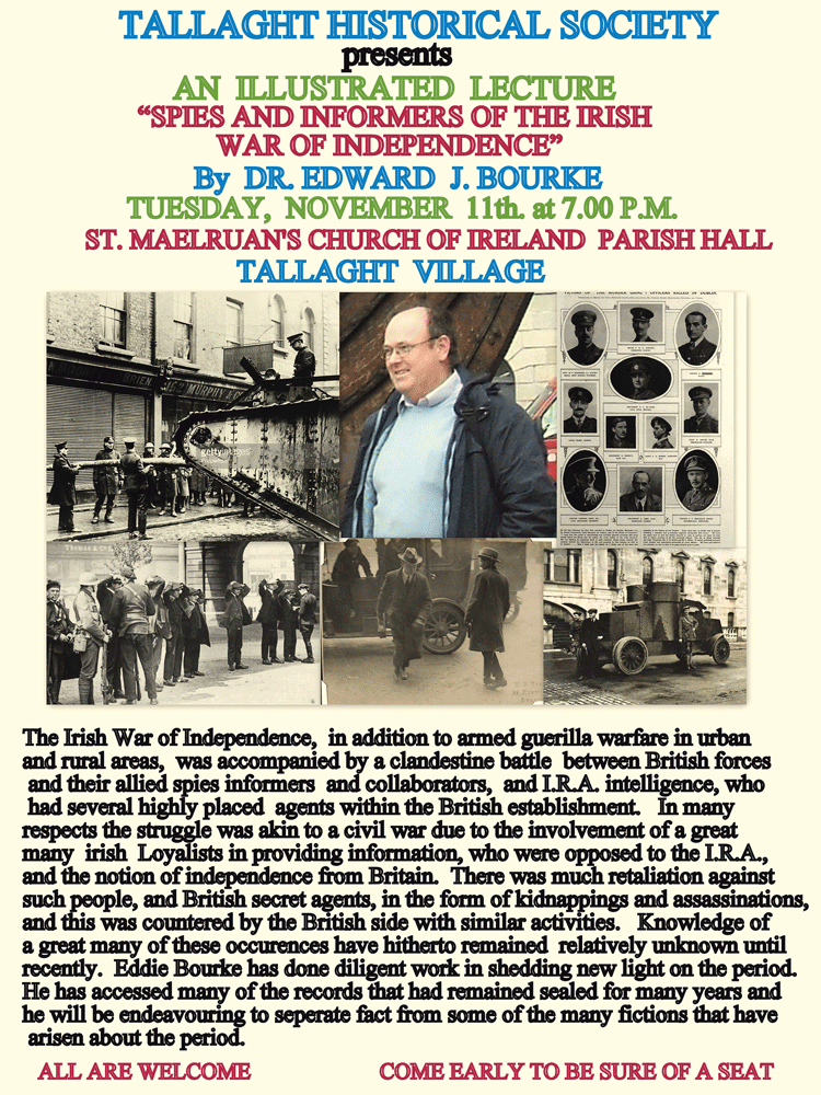 Dr Bourke will be delivering his illustrated lecture “Spies and Informers of the Irish War of Independence 1919-21” on November 11 in the parish hall of St Maelruain’s Church in the Tallaght village at 7pm.