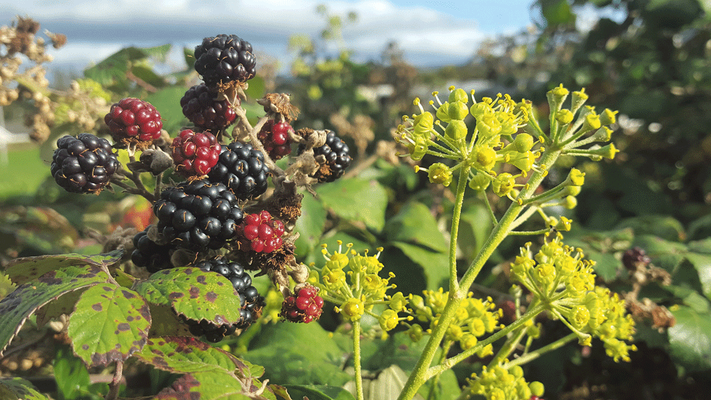 Blackberries and flowering Ivy provide food for wildlife in the late autumn hedegrows
