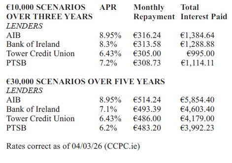 To assess the local market, we examined the cost of borrowing €10,000 over three years and €25,000 over five years from lenders serving the Clondalkin area.